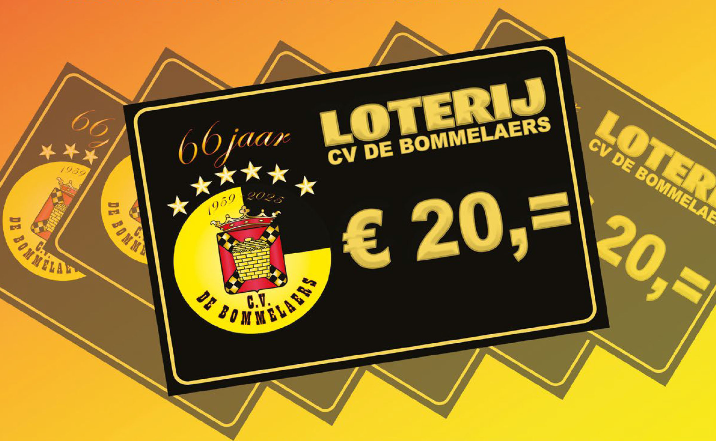 Voor de loterij (die eenmalig gehouden wordt) zijn slechts 1.250 loten beschikbaar, welke 20,00 euro per stuk kosten. U maakt dus 11x kans op 20x uw inzet! Aan ons, CV De Bommelaers, de uitdaging om alle loten te verkopen. En aan u het verzoek om mee te doen ; )