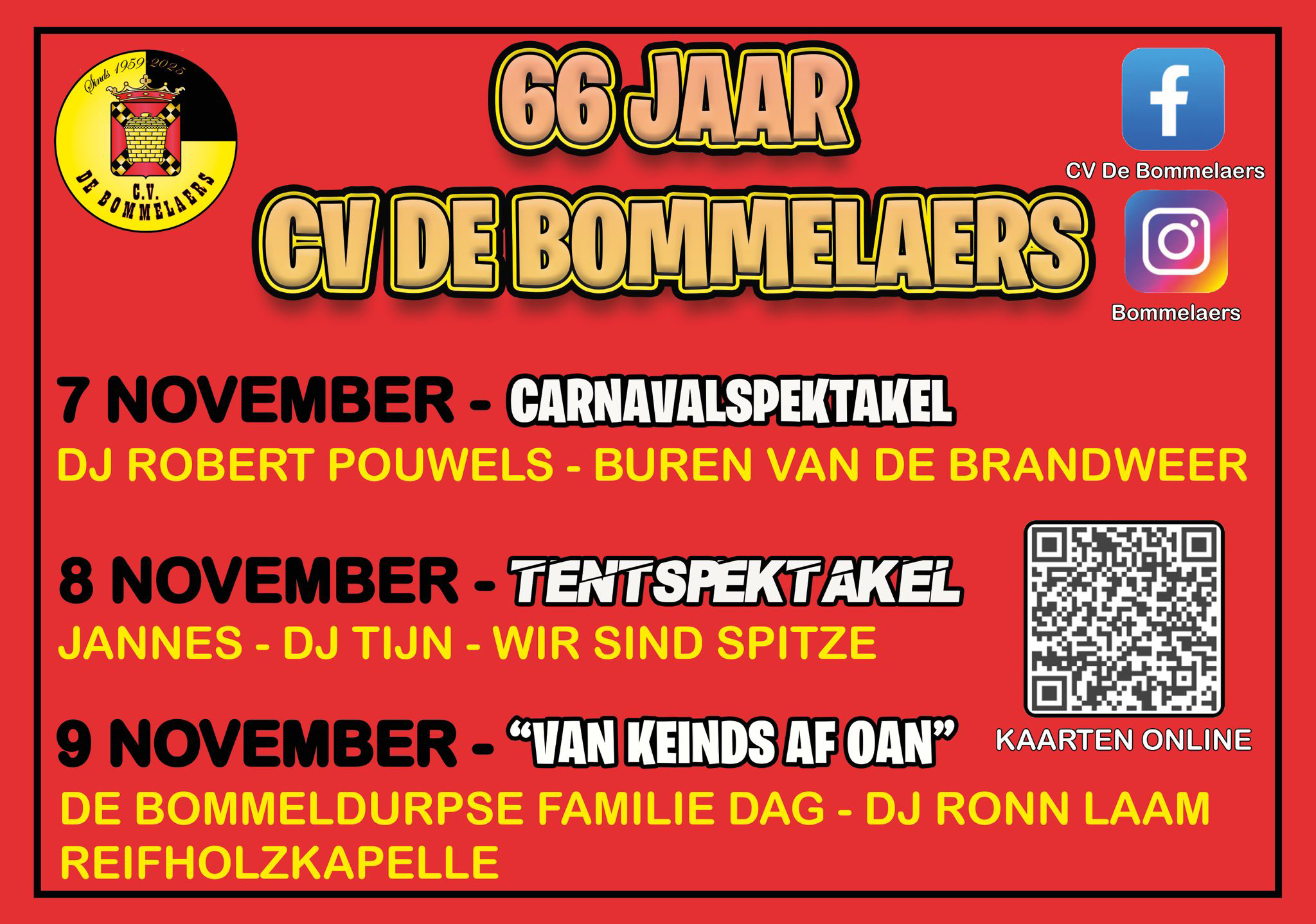 We bestaan dit jaar 66 jaar en dat gaan we groots vieren en wel tegelijk met ons 1e Maas en Waalse 11e van de 11e feest, dat voor de 4e keer zal worden georganiseerd op: vrijdag 7 november, zaterdag 8 november en zondag 9 november. Het wordt voor alle Bommelaers en Bommelaerinnen een prachtig feestweekend, met daarbij een extra Maasbommelse familie- en reüniemiddag: 'Van Keinds af oan'.